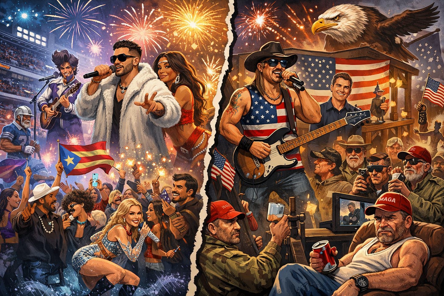 Enter the counter-programming: a “patriot” performance promoted by Turning Point USA, featuring Kid Rock and marketed as the “real America.”